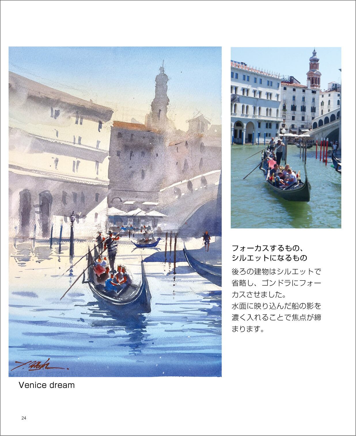 水彩画とその描かれた風景の写真を並べ、画家が絵を描く際のポイントについて語った文章も一緒に掲載。